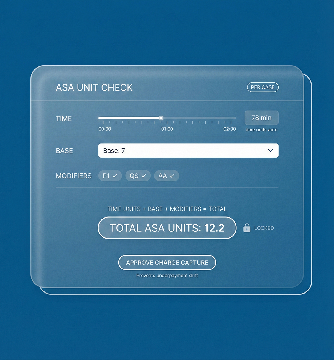 We reduce underpayments by aligning payer contracts to accurate ASA unit calculation and anesthesia time-based billing rules.